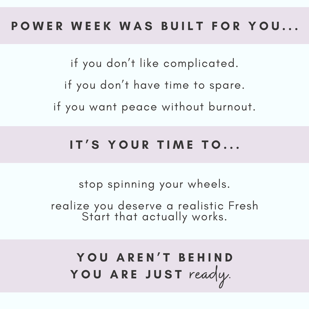 You don’t need complicated binders or endless checklists. You need a realistic system that fits your life right now. That’s exactly what Fresh Start: Power Week delivers with helpful videos and digital resources.
